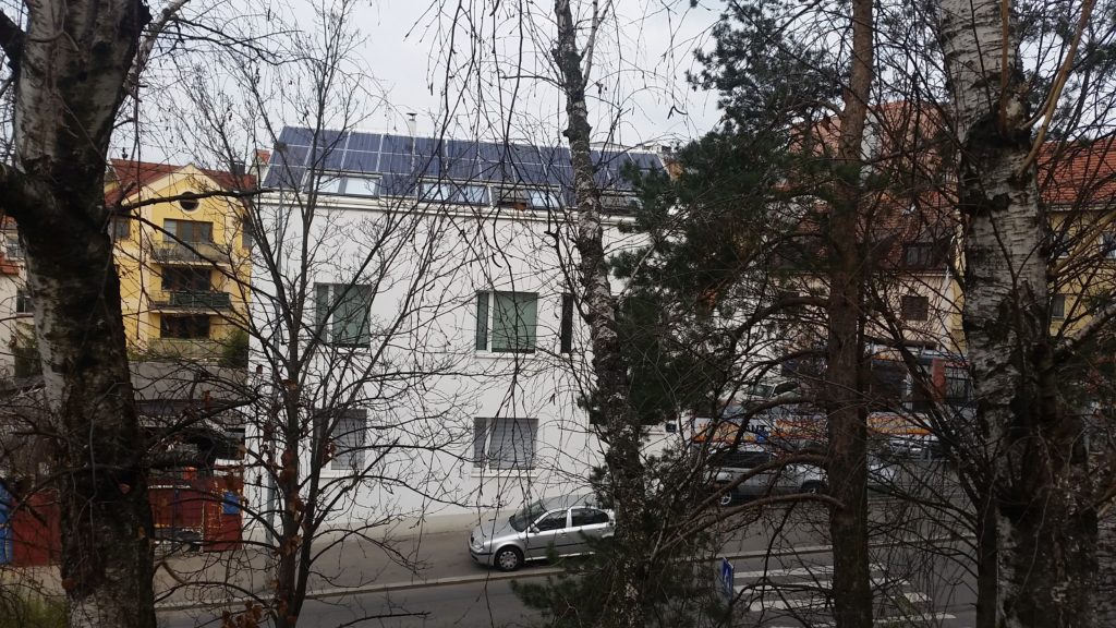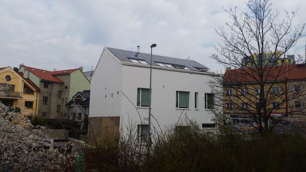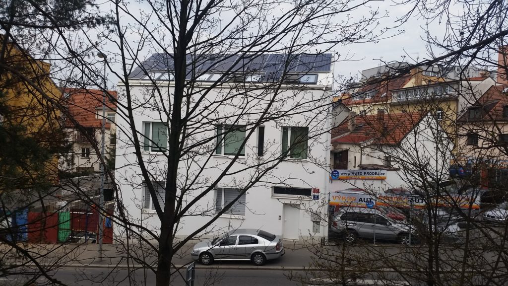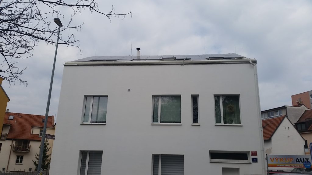 Fotovoltaická elektrárna byla postavena na střeše bytového domů a architektonicko-urbanistické kanceláře. Cílem zákazníka bylo proměnit stavení z 19. století na moderní pasivní dům s pracovištěm pro architekty v přízemí a bytovými prostory v patře. Pro tento projekt jsme navrhli a postavili střešní fotovoltaickou elektrárnu, která pokrývá přes 50% spotřeby energie v budově a napájí kotel a tepelné čerpadlo. Ukládání energie se řešit nemuselo vzhledem k tomu, že díky neustále běžícím počítačům je dostatečná spotřeba energie během světelného dne.