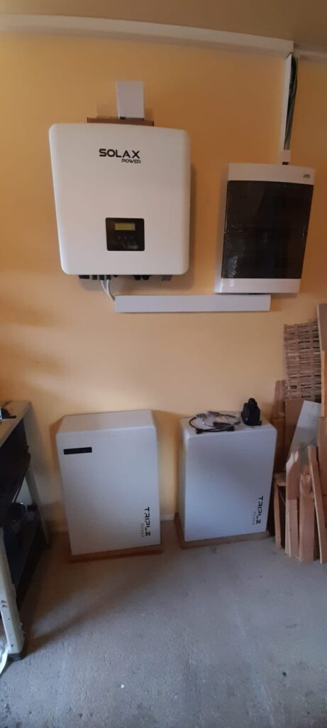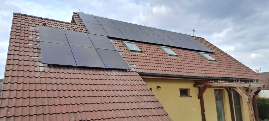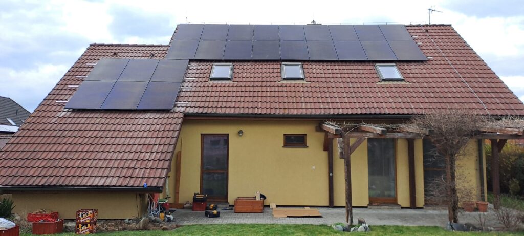 Fotovoltaická elektrárna na střeše rodinného domu v obci Úvaly. Výkon: 9,6 kWp, akumulace: 11,6 kWh